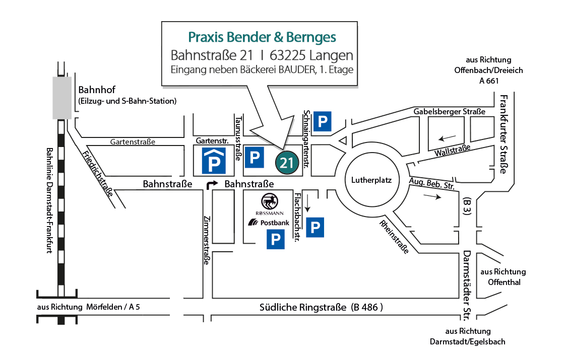 Sie finden unsere Praxis im Zentrum von Langens Einkaufsmeile in der Bahnstraße 21, schräg gegenüber der Drogerie Roßmann.